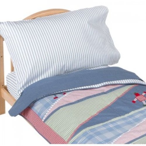 With soft reds, greens, and blues, in various stripes and plaids, and delightful robots, this bedding set is great for your toddler. Set includes a comforter, flat sheet, fitted sheet and pillow case. Made from 100% cotton. Machine washable.
